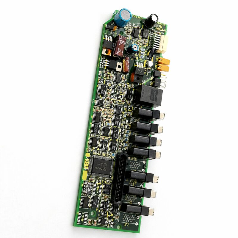 Het control board — de A20B-2001 serie — beheert alle intelligentie: de DSP-verwerking die de servo-control algoritmes uitvoert, de seriële communicatie-interface met de CNC-controller via FANUC's glasvezelkabel, en de gate-drive signalen die de vermogentransistoren vertellen wanneer ze moeten schakelen.